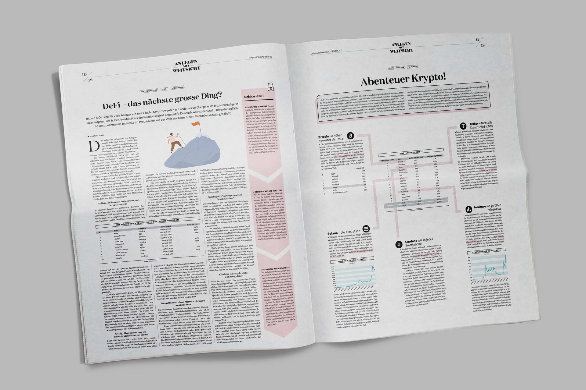 Die Verlagsbeilage liefert Antworten auf die wichtigen Zeitfragen der globalen Finanzmärkte, unterstützt Investoren im Umgang mit traditionellen und neuzeitlichen Anlageprodukten und beliefert die Anleger mit neuem Wissen – in Form von Interviews, Wissenschaftsbeiträgen, Publireportagen und Statistiken. Quade & Zurfluh hat in Zusammenarbeit mit Scarossa die aktuell erschienene Ausgabe konzipiert und gestaltet.
